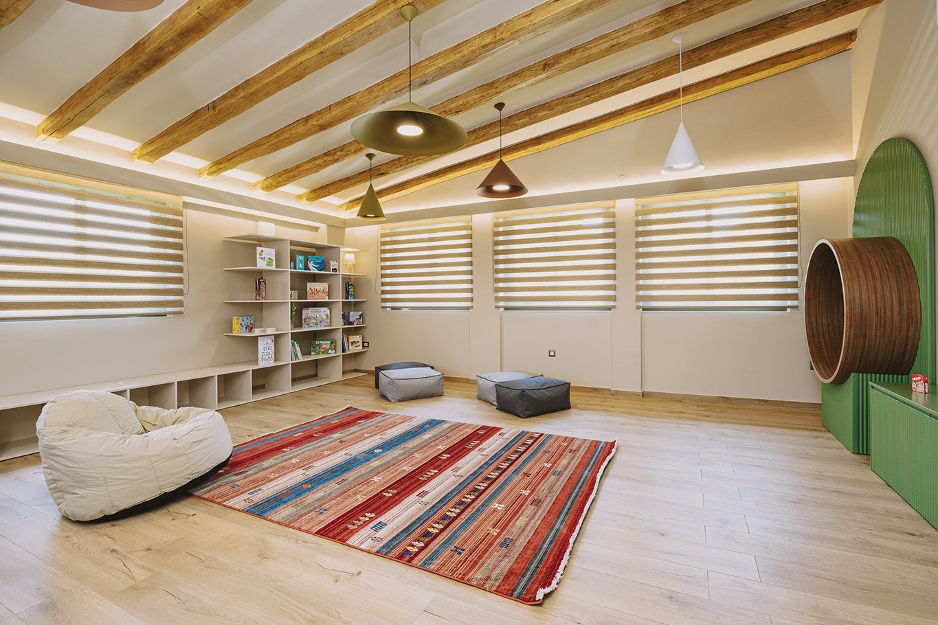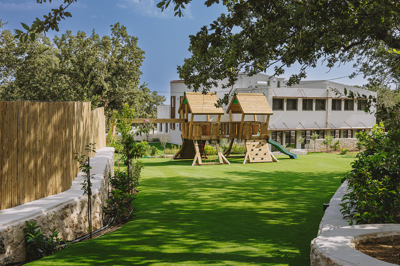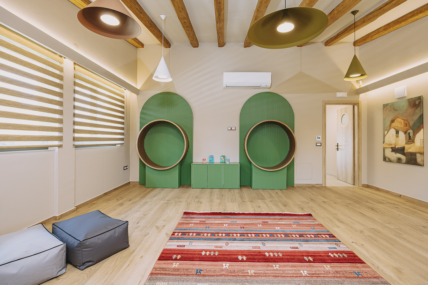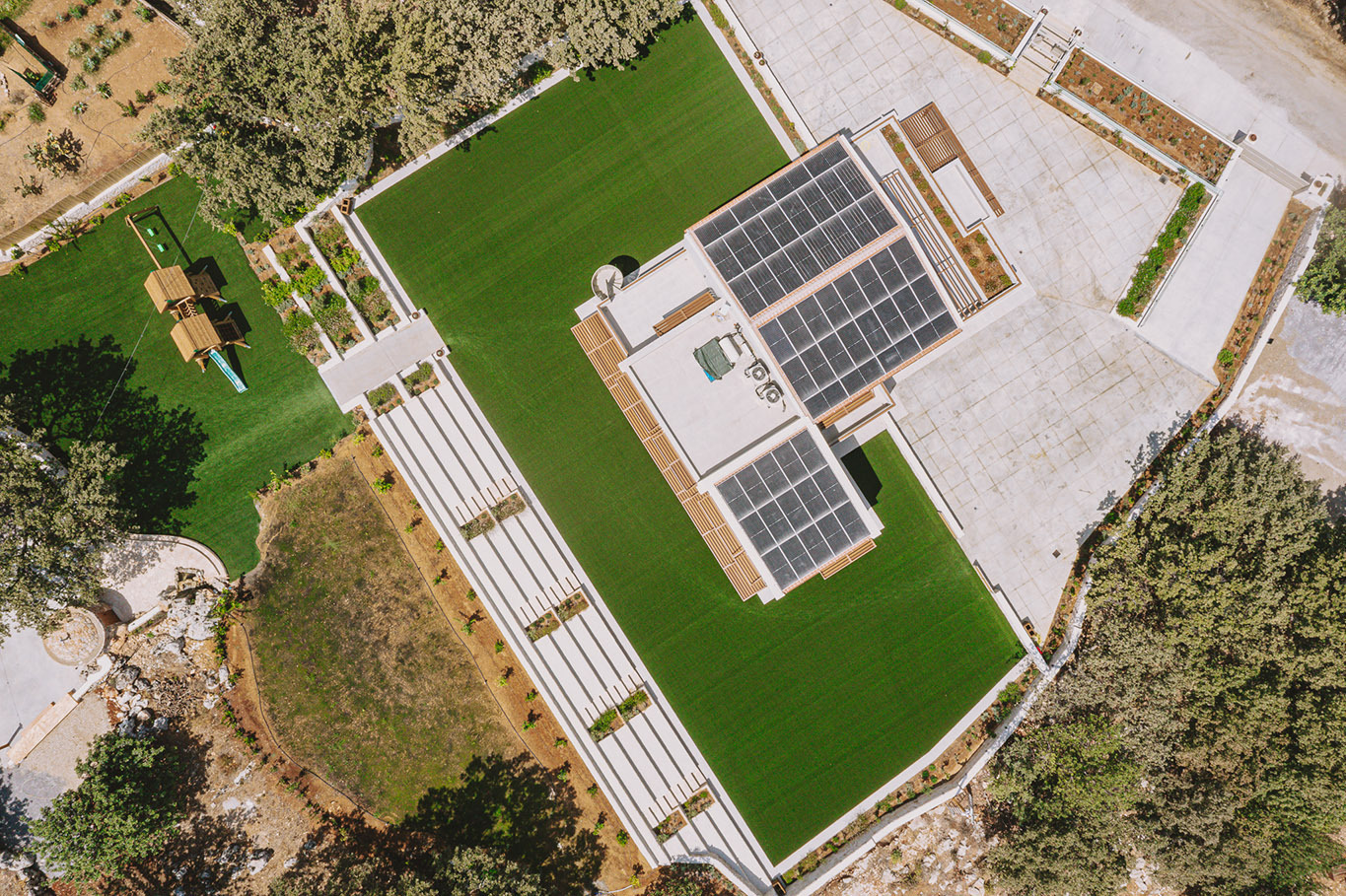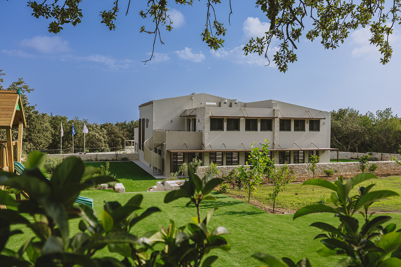 The 600 m2 building blends traditional and modern architectural elements, harmoniously integrated into the natural surroundings. Every area is meticulously designed to facilitate experiential learning, free expression, and children’s development: