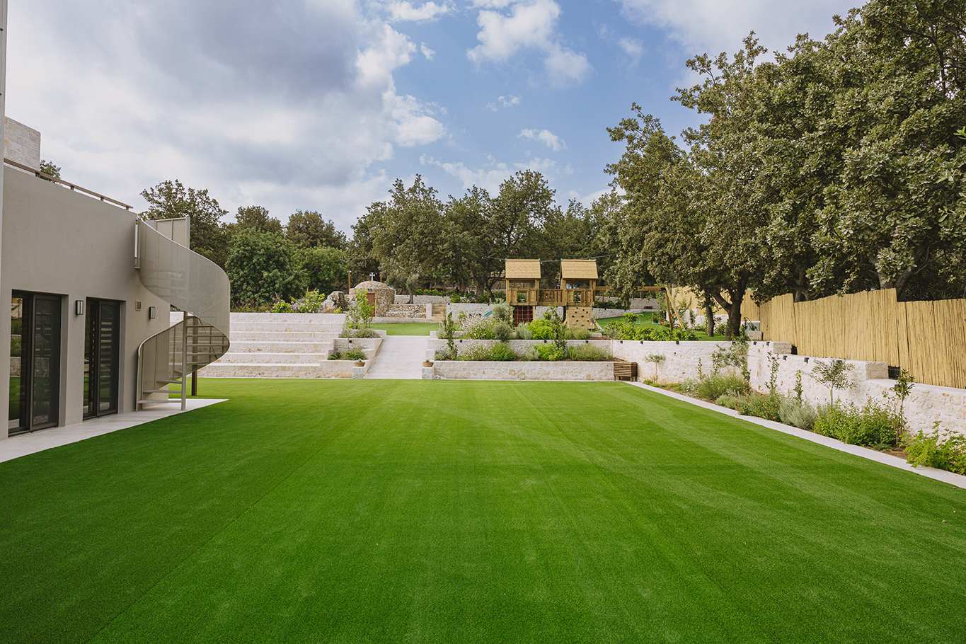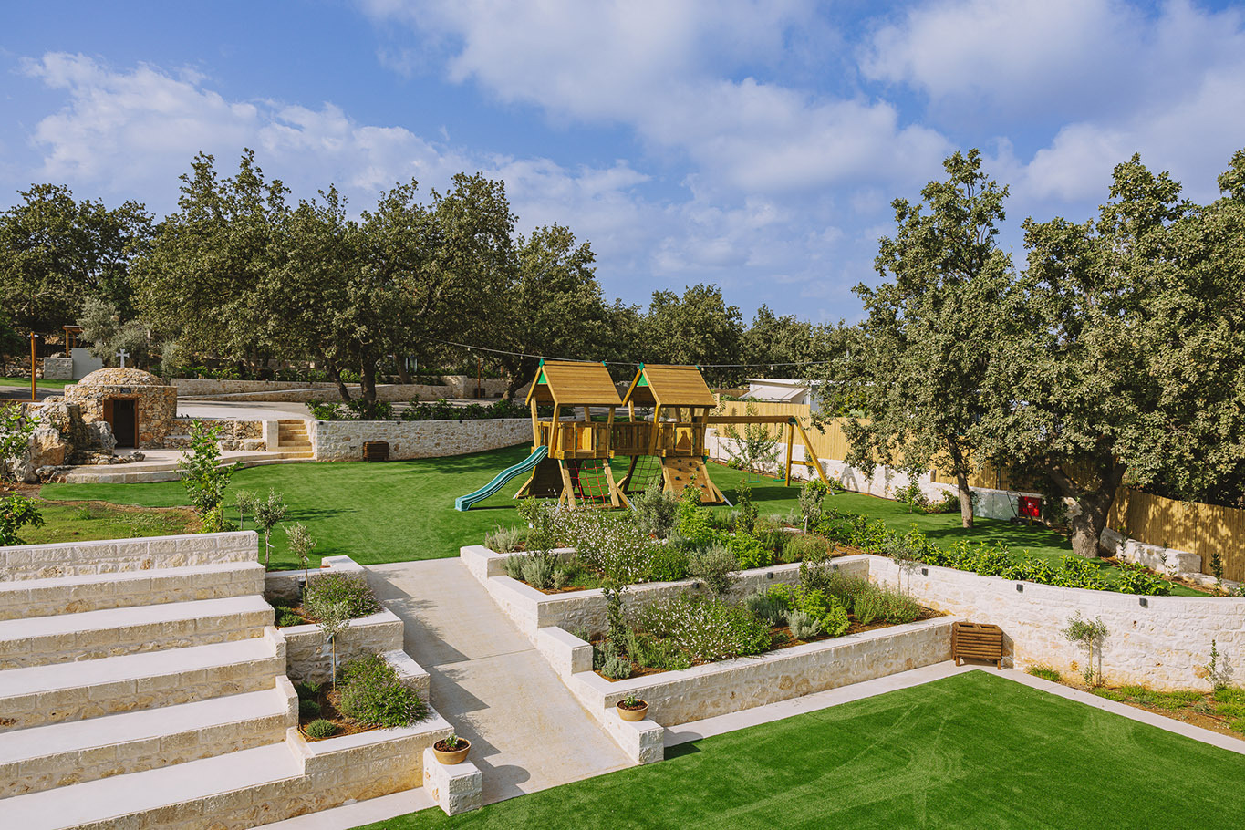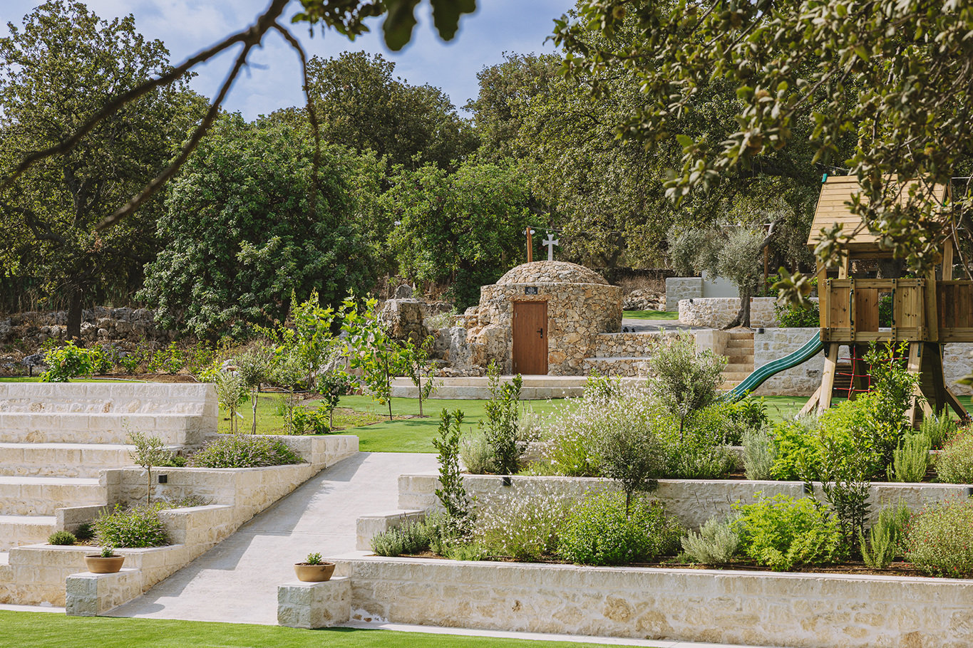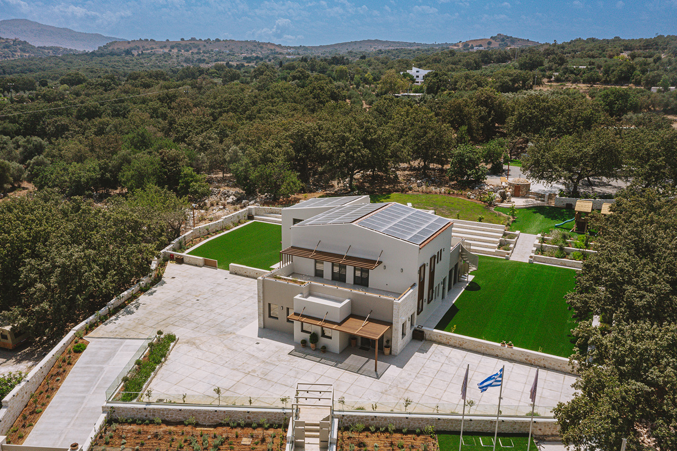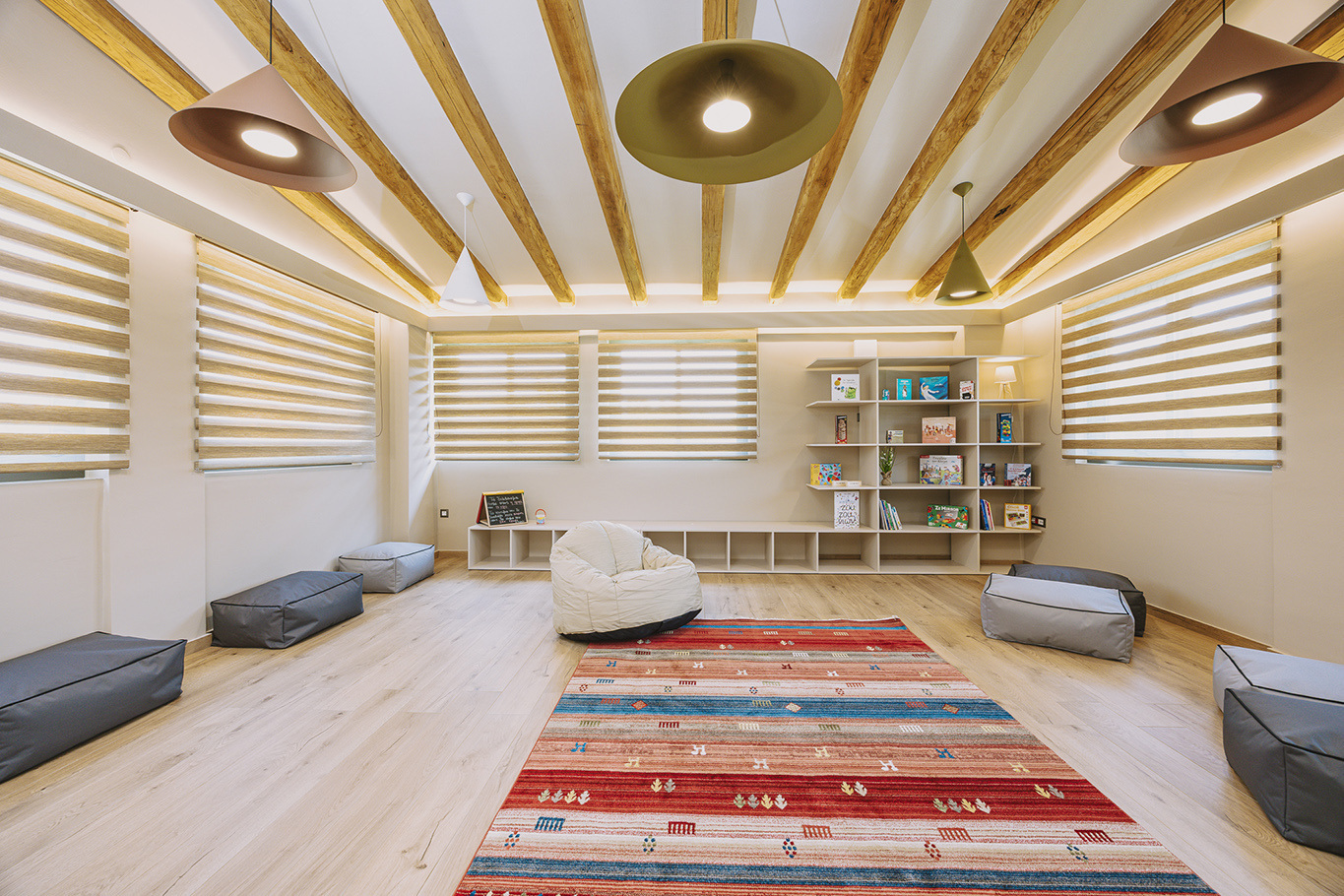 The 600 m2 building blends traditional and modern architectural elements, harmoniously integrated into the natural surroundings. Every area is meticulously designed to facilitate experiential learning, free expression, and children’s development: